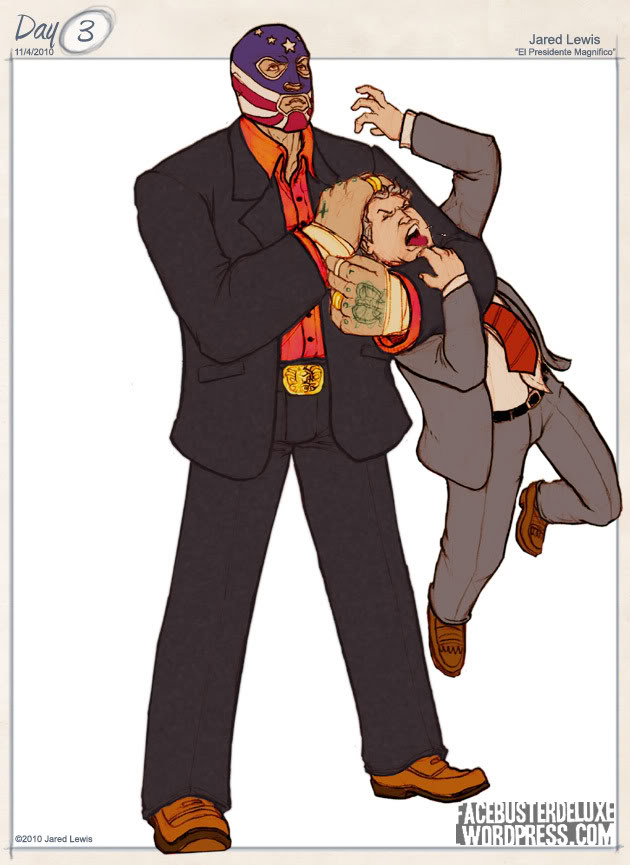 His citizenship was viciously contested by the opposition & the press. Rigged ballots & international conspiracies came into question. But everything checked out & that following January 20th, before a record crowd gathered on the lawn of the National Mall in Washington, the hapless wrestler prepared to be sworn in. It was on that day that El Lobo Loco traded in his wolf mask for the stars & stripes. The decision was heartbreaking, but fully supported by his father (who would go on to resume the mantle of El Lobo Loco). From that day forward, the child that was born in that wrestling ring in Nogales, Arizona all those years ago would be known only as El Presidente Magnifico, America’s First Luchador President!