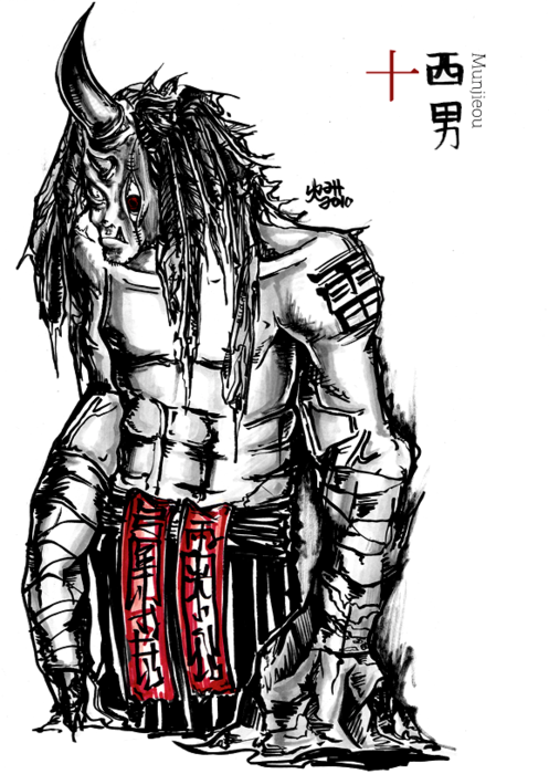 Munjeiou, like his sibling-aspects has two horns as well, but wears giant fuda as a sash. He is permanently covered in hoarfrost and his hands continue into large lumps of perpetually shapechanging ice blocks. He points the way to the Parade to those who die disappointed, remorseful, to those who are crushed under heavy things, and those who die thirsty in the desert. Munjieou very much looks forward to the Parade every year, as seeing new Walkers makes him feel nostalgic and proud of his job.