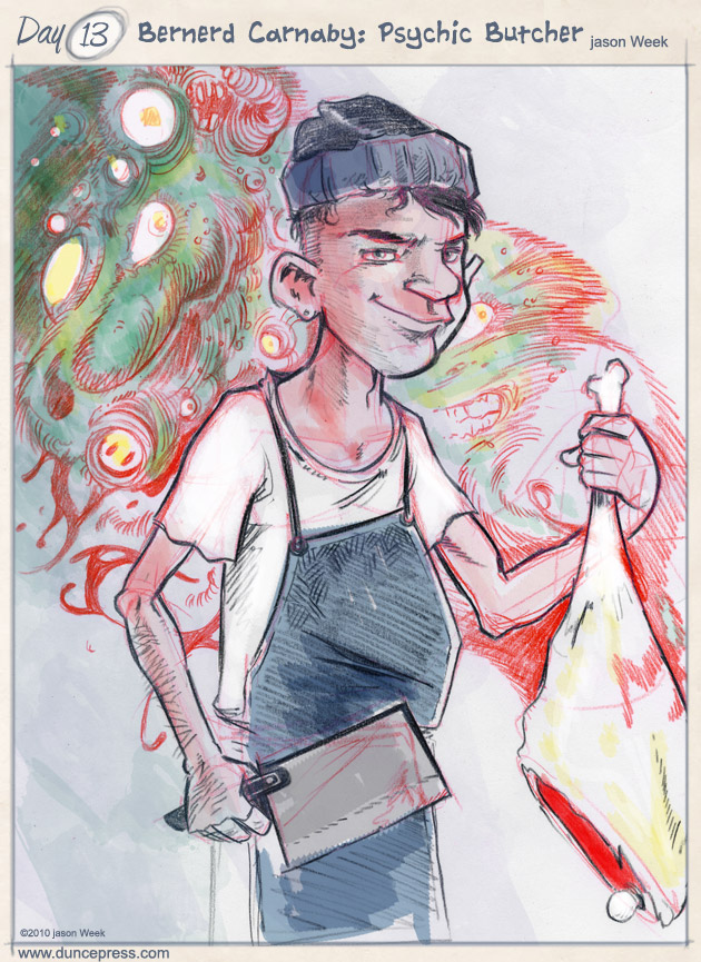Through his chosen profession as a butcher, Bernerd Carnaby is daily exposed to dozens of animal carcasses ready for production. It is rather unfortunate then, that Bernerd also happens to be psychic. While he cuts, he is constantly hounded by the ectoplasmic, shoggoth-like consciousness that all farmed animals are tied to on the astral plain.
