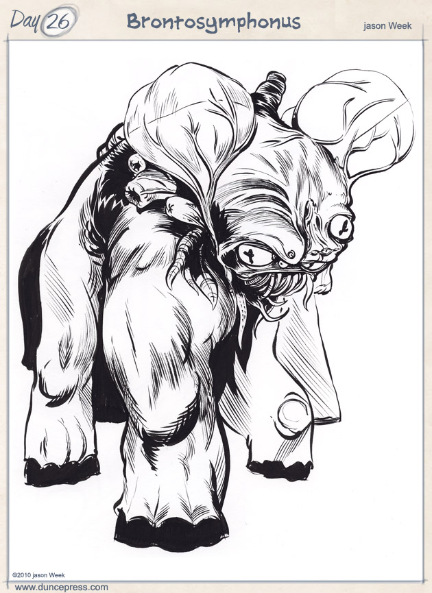 The Male* Brontosymphonus is one of the largest terrestrial organisms on the planet Silaxes, weighing about the same as a bull African elephant at standard earth gravity, and nearly 5 times that at native gravity. It communicates via the two large vocal sacs located on either side of its head. In the thick atmosphere of Silaxes, these calls can travel for many dozens of miles — allowing a troop of Brontosymphonus males to spread out over an incredibly wide area while foraging for food.