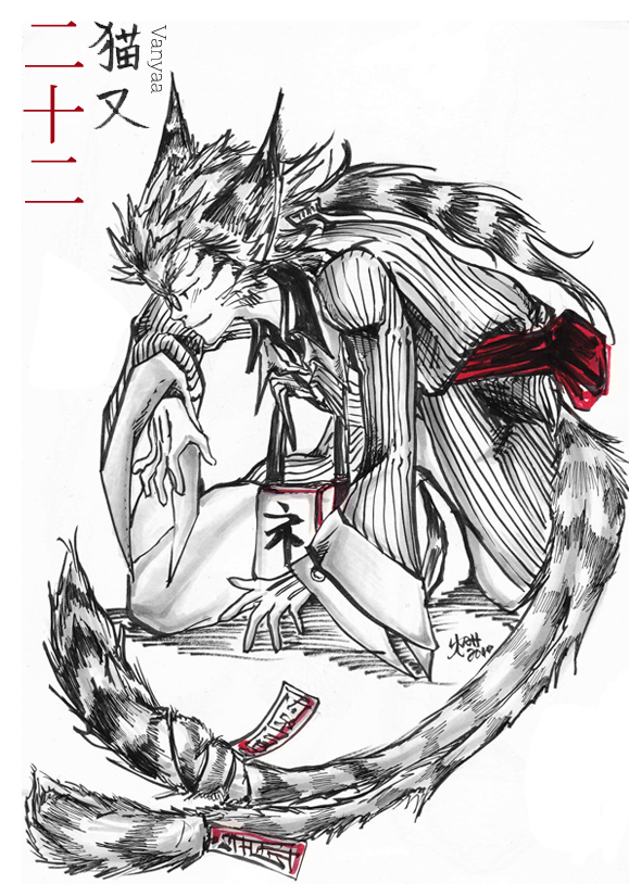Vanyaa is a nekomata », a split-tailed Tomcat spirit. Being as what he is, he is able to sneak in between World Layers without having to wear too many fuda to ease the transition. His name is a pun on the person he is based after, and ‘nyaa’, which is onomatopoeic for a cat’s meow.