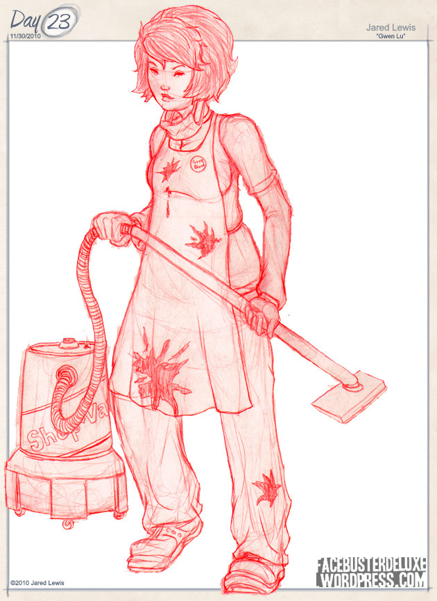 So this is the first of three in a series of nurses out for blood. This is Gwen. Of the three, she is the reluctant one. So instead of carting around weapons like the other two, she follows them around with a shop vac. A shop vac for all the blood. Was trying to make her look a little short & rounder to have more variety in the shapes I’ve been drawing. Although she starts out going along with the other two, she’s probably the ultimate hero of the story.