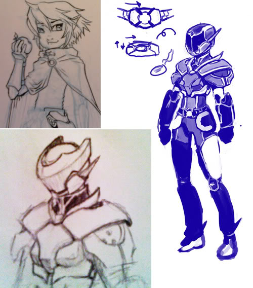 I’m really big on colored pencils and ink, and digital media. Due to time, I’ll mostly be exploring concepts rather than polished works. So, a digital sketch or so, like this little quickie of me to the left, and maybe a bit of writing to explain the story or concept. I try really hard to give an idea or purpose to each character I create!