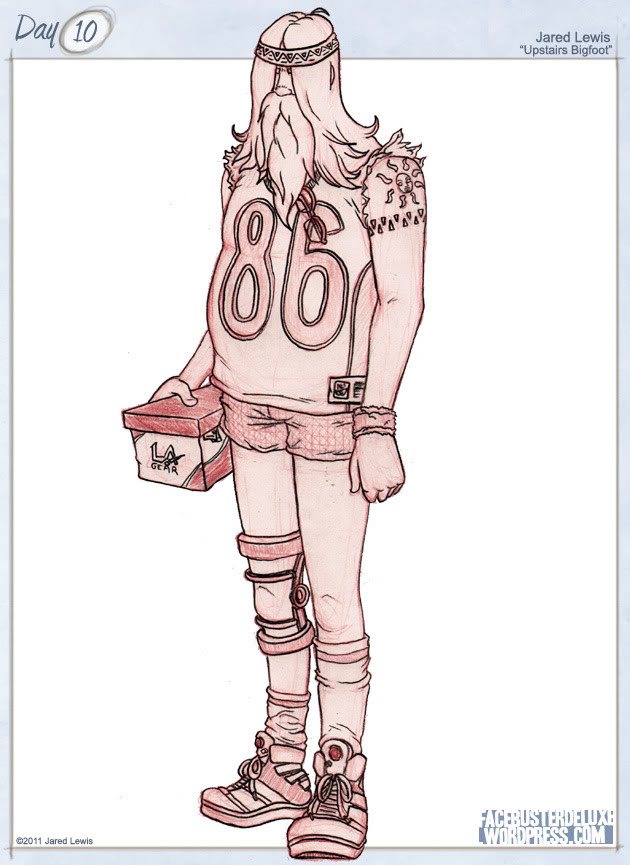 I have lofty ideas of doing a comedy strip thing. This is the only solid character idea I have for it so far. The idea came from when I was living at an old apartment, & these stoners would knock on my door at all hours & forget that the apartment they were really looking for was the one upstairs above me (how you forget a flight of stairs…?). It was my guess the guy above me must’ve been their… you know… connection, though I never saw the guy. This comes from that. In the context of the story, the protagonist isn’t so much interested in what it is “Upstairs Bigfoot” is selling, so much as just curious as to his existence, as if he was some sort of cryptozoologic wonder. I also think that while “Upstairs Bigfoot” is essentially mute, he’s one of those characters where people complain about their lives to him, & somehow, in his silence, he somehow helps them come upon an epiphany that solves their problems. And yes, he wears Reebok pumps, but keeps his stock in an old LA Gear box. A women’s LA Gear box.