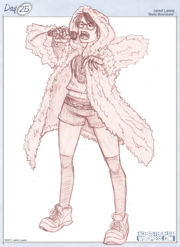 ‘Female Russian Rap Prodigy’ was on my jumpoff list. I opted Ukraine instead, but you get the idea. I created her less with a story in mind, but thinking a lot more that at some point, I’m going to have a story where characters are listening to ridiculous music, why not make that up now. Originally, I was toying with making her a supervillain, with like terrorist ties & maybe explosive powers of some kind. But I think it’s better if I just play it kind of plain & normal on this one. Never had to draw a fur coat before. That was new. That aside, I like this character a lot. I’d like imagine that her MC style is pretty grimey & rough given the accent but it contrasts soaring Southern rap synths she’s over top of well. But it’s music in a mute medium so ultimately it’s up to you.