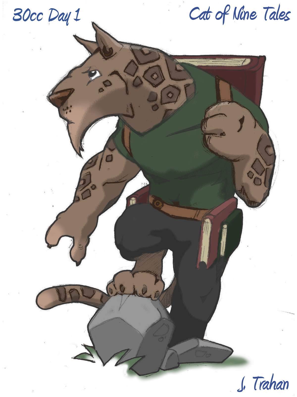 The Cat of Nine Tales is an enigmatic feline. He travels the world, collecting the best stories either through his ears or through his adventures. If you are lucky enough to find him and lucky enough to catch him in a generous mood, he might be inclined to open one of his books or scrolls and share one of his treasured tales with you. It is said that he is looking for the ten best stories of the world, but for years he has wandered, one story short of his goal.
