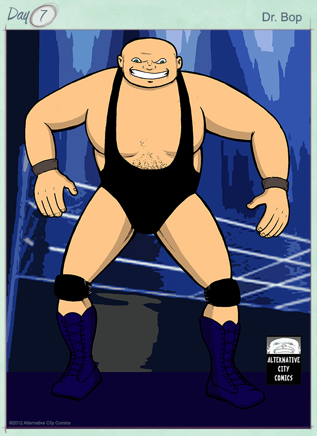 A former professional wrestler that was banned from the sport for not sticking to the script and at times pummeling his opponent to a pulp. Bop was last seen in a cameo working as a bouncer at Club Alternative (see Alternative City #0 ). In the future expect to see the 400 pound man-child in upcoming issues of Otis Wonder Investigations. It is Dr. Bop’s face that I use on the AC comics logo just because he’s such a handsome fella.