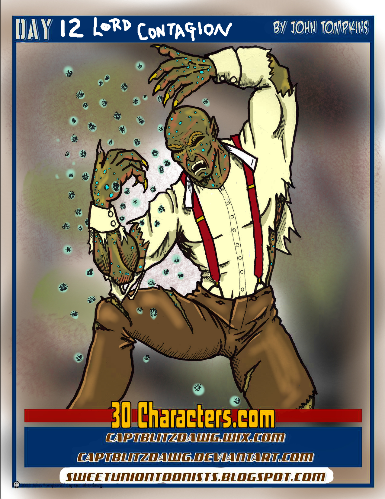 Lord Clarion had an extreme interest in micro sciences- molecular science, microbiology, light particles, etc. As part of his research, Lord Clarion gathered dust from ancient tombs, meteors, hospitals and trash heaps to examine what was happening at the smallest of observable levels. Somewhere along the line, the dust from one of these odd locals contaminated and changed his body. Lord Clarion can spontaneously turn into Lord Contagion, a hideous creature covered in small sores that turn a luminescent blue before releasing spores that cause a variety of horrid and ghastly infections and ways to die. Lord Contagion is happy in his research, now getting to observe the random actions of the spores that come from his body and ill others.