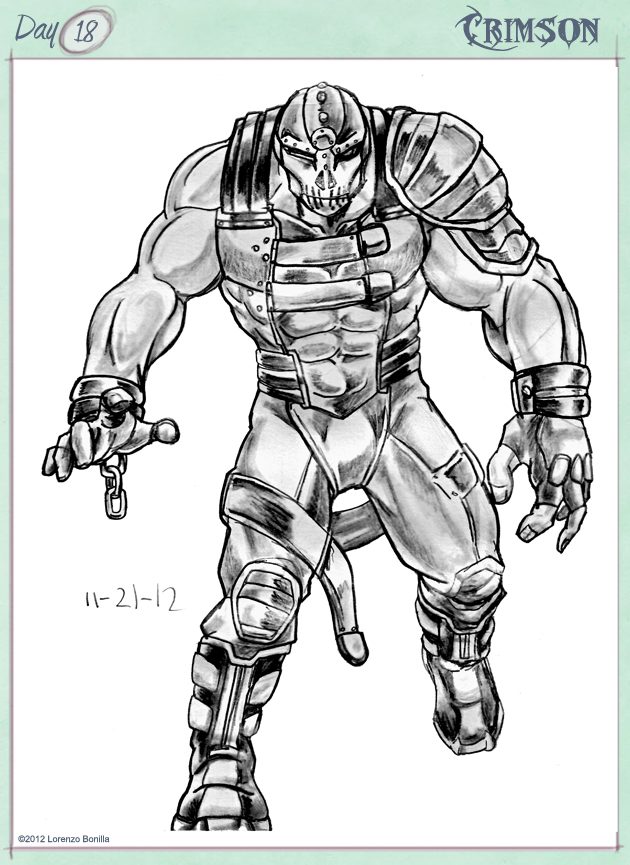 Conception: Crimson was one of my high school creations as I was looking for a Juggernaut/Bane fusion and developed this character over time as I originally had him with enchanted boots, gloves, belt, and a mask, but abandoned those aspects due to the convoluted look of him and streamlined it down to a few armor components with aspects of a special prison/asylum uniform.