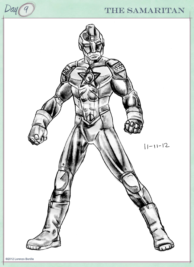 Conception: From a stockpile of blank character slates awaiting development, I developed the Samaritan based on the premise of using a hero to take over another prominent character with a general enough power set that should it get killed off, it will be forgettable and able to resonate for a story arc. His arc serves as a cautionary tale of taking on more than you can handle, while showing the noble sacrifice that all heroes eventually have to do for the good of those that they vow to protect.