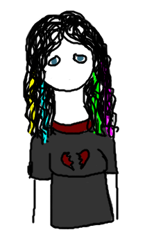 Hair: Deep, dark black. The kind of black you only get with dye. It sweeps across her forehead in angry bangs, and flies out from behind her head.