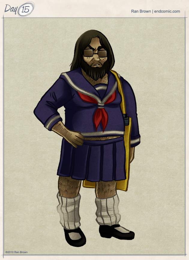 I designed him last week for two pages of The End. The script called for him, and I think I made him less horrible than I could have. I want to make it clear that I don’t have anything against nerds (I am one!), cosplayers (I am friends with many of them), or even crossplayers (most crossplayers are girls, actually). But you see people like this at anime conventions, and there’s no getting around that. They exist. For realz.