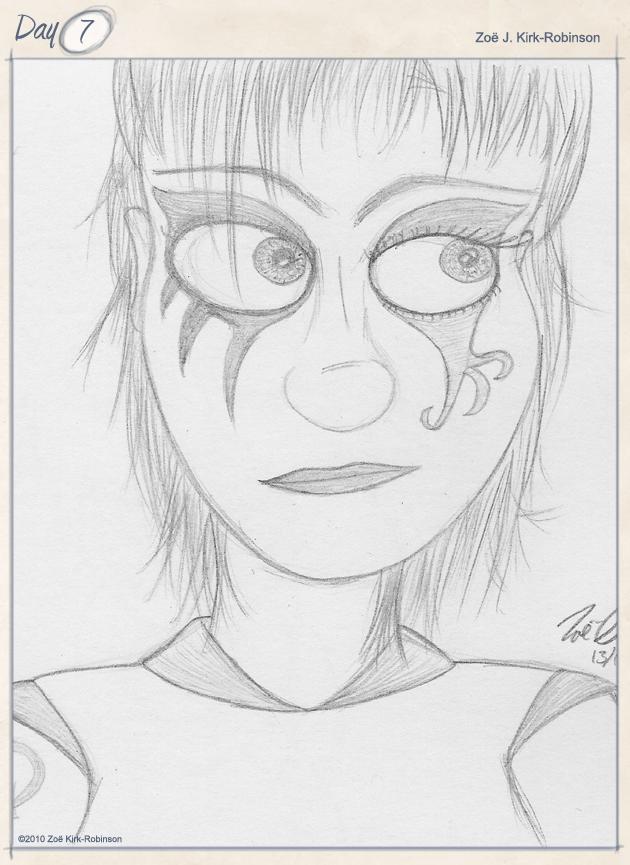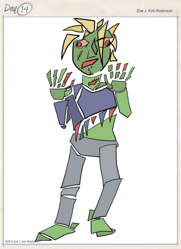 In terms of the art for this one, I’m mostly pleased with the overall look and the colour scheme. My major issue is with the general proportions, the legs and the feet. I’m going to have to really work hard at improving my ability to draw legs, that’s for certain. Still, with 29 more characters to go perhaps the last one will look vaguely like a human? Providing the last one is supposed to look like a human, that is.
