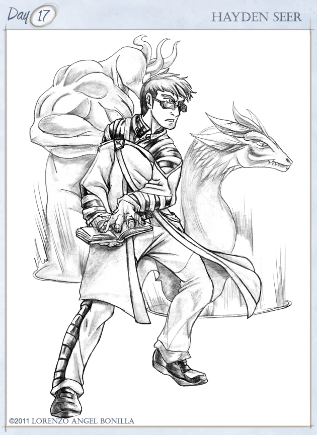 Abilities: Hayden is a specialist in a rare form of summoning magic; where he summons images that are his own creation. As such, Hayden carries around a portfolio book with drawings that he has drawn and summons them via a blood seal offering. The creatures that Hayden summons exist as long as Hayden is willing to offer the blood for their continued existence as size determines the blood offerings, as a larger creature will require more blood and a shorter duration compared to a smaller creature and a longer time limit. As such, Hayden usually keeps his summoned creatures between 90 seconds to 15 minutes summons no more than three creatures, as such any longer or any larger and Hayden begins to feel the effects of blood loss immediately.