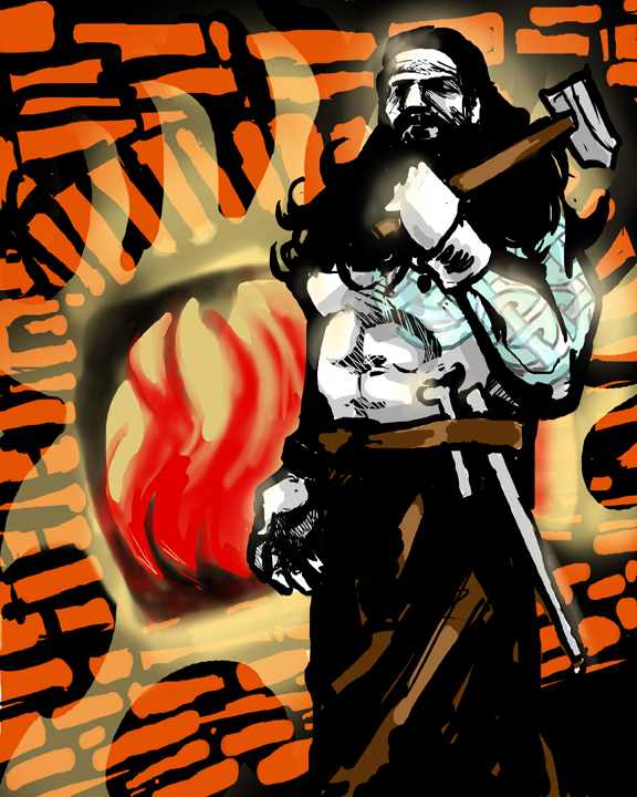 The magician Blacksmith: covered in spellbound tattoos, creating bewitched iron works to protect villagers from demons and specters.