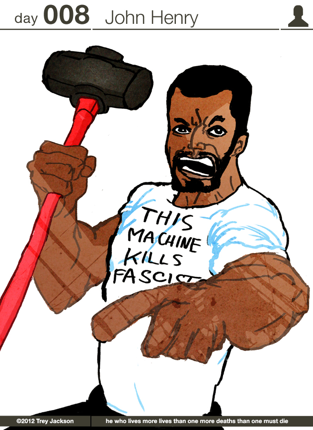 John Henry is a Universal Algorithm, an avatar of life that keeps inorganic beings and control systems in check. He is a living set of instructions that fights an eternal war against The Machine, The System, Control. He’s a machine that beats machines - any machine - but the greater the feat the more likely he will have to die and reincarnate. His greatest power is sacrifice — he is able to work himself to death to achieve some great feat (often one people think only a machine can do) and then arise, Phoenix-like, from the ashes.