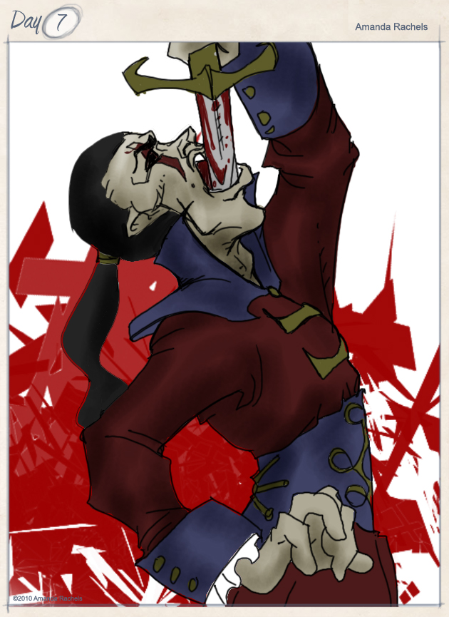 Imagine, mes amis, a mere man for whom the rapier’s edge is no risk! An immortal so dismissive of the sword, he invites it into his gullet as an hors d’oeuvre! Observe as the iron-throated Hiltengarde ingests an arsenal extraordinaire and emits not an ounce of crimson extract! HOW does he live? WHY does he not bleed? WHERE do the points delve safely within? Questions inconsequential! Pertinent only is your perusal of his performance! The swordsman supreme will display the danger of his devices! A dagger for a dying damsel! A machete through man-meat! A stiletto for a still-beating heart! And each blood-blessed implement passed perfectly from person to palette! Nary a wasted, precious drop! And, now, partakers of the purulent, prepare to participate! Hiltengarde is here! Time for volunteers!