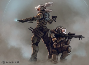 About the Artist: The artist is named Anthony Scroggins and can be found on deviantART. I found the piece I used for Resurrection Blues called Blue Planet because it showed a powered armor user approaching a factory, much like the story did. I considered it serendipity. I later found the deviation “As One” used in this piece and liked it.