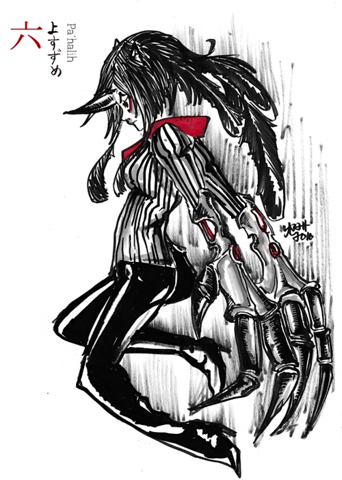 The Yosuzume is a traditional Japanese demon that resembles a bird. Very loosely did I base Pa’halih on this, merging it with various mythological aspects of women taking on half-bird forms. That, and the obvious Pahaliah » who is an angel of conversion. Ideally, one cannot fully join the Parade unless one is divested entirely of mortal constraints, and Pa’halih is there to do the job.