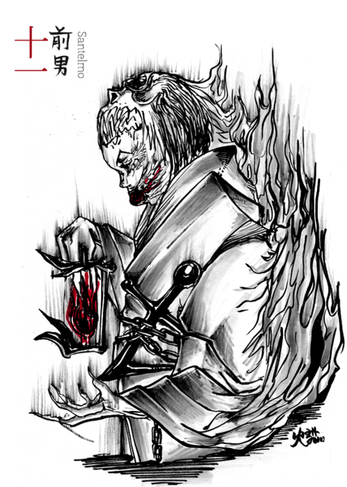 The Four Fires are essentially like the Four Snows except in essence. Santelmo comes to those who die hoping, who die struggling, who die defiant, he comes for the drowned who try to swim to the surface or who are lost in a storm. In place of fuda which allow the aspects to travel the World Layers, the Four Fires carry lanterns, and instead of the Snows’ twin horns, they have embers. Santelmo’s ember is where anatomically a human’s mouth would be and every breath makes it glow.