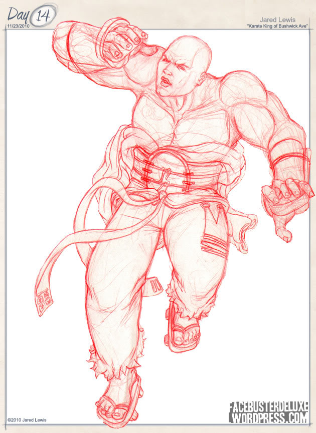 Originally, the forums for the site Entervoid.com had an art jam to create a superhero using a name & a power generator. I got Karate King on the name generator, & the unstoppability of the Juggernaut with the power generator (though they also called it the Rhinoceros Effect, which I really, really like). Anyway, I’m not an art jam kind of guy, but that was kind of too cool to pass up. So I finally made good on it & drew him up. I added the Bushwick bit because I was kind of thinking of Shonuff the Shogun of Harem, but also had this kind of silly idea about what happens to a street level superhero with gentrification.