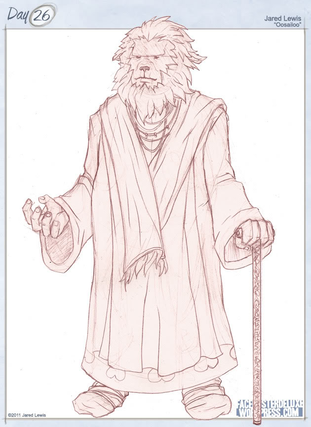From a story I’m working on called TransModo. In the story, Oosho, mentioned above acts kind of as a sidekick to one of the characters. I marked this scifi in the sense that this character is an alien & the story he comes from takes place in the future. Otherwise there’s nothing particularly scifi about him. I’m a big proponent of making aliens nothing like humans. Having any human characteristics whatsoever kind of defies probability. Still, that’s a tough order when you got to build something to empathize with. So the Mu characters are kind of stubby white, sloth creatures for the sake of ease. Otherwise, most of the other races are radically different. Another thing was that the planet the Mu’s inhabit is marsh. I meant to kind of dirty up this guy’s robes but it was either dingy it or try to keep reaching for 30. So I’m shooting for the 30.