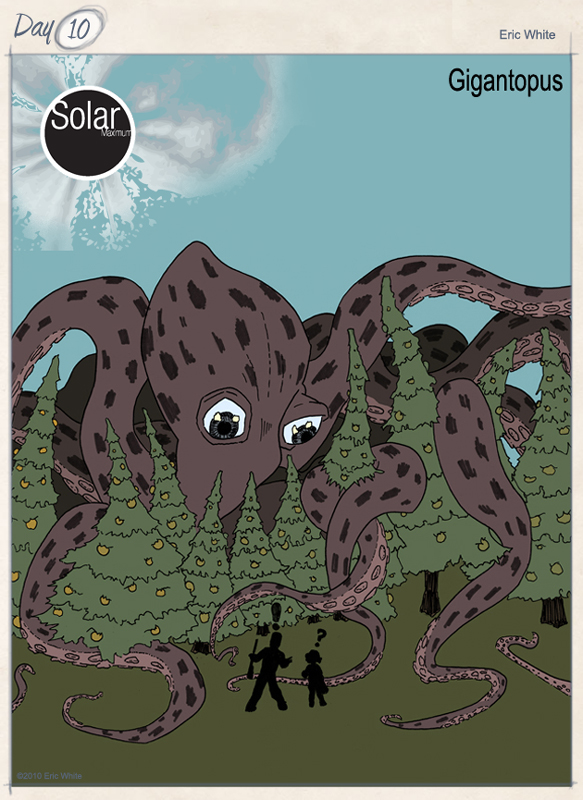 One early morning Fin and Billy struck out to bring back a basket of the odd fruit but when they reached the patch of forest where it is found…they encountered an enormous octopus who was gorging itself on the fruit. Noting that the monster, which on earth is obviously lives only in water, seemed quite comfortable and happy to be walking and eating on land, Fin and Billy quickly high-tailed it back to the lab to report on their findings. Gigantopus, as Billy called it, did not seem aggressive or violent but upon that first encounter there wasn’t much intensive to stick around and make friends.